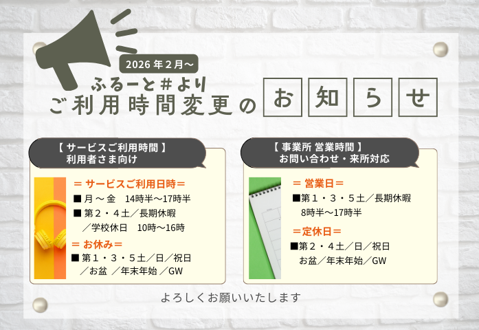 | ■令和4年11月1日 放課後等デイサービス音のあそび場 姉妹校「音のあそび場 ふるーと#」 春日井市岩成台にオープンしました。 ~地域の皆様、どうぞよろしくお願い致します~ ![]() |